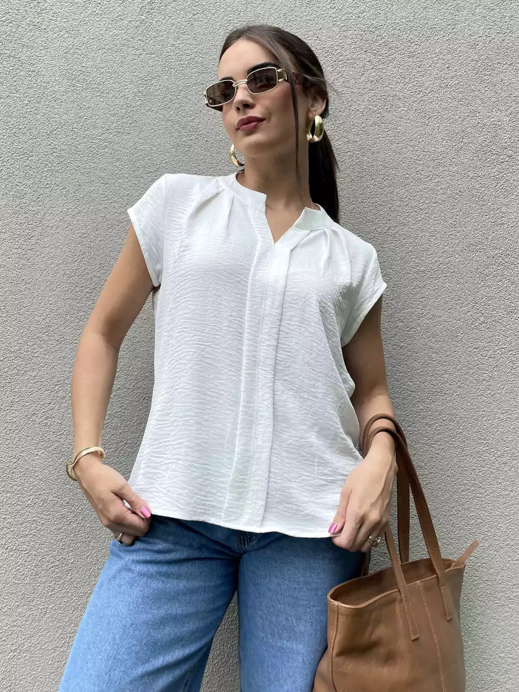Blusa estilo bata, com mangas curtas aliadas à gola anatômica e pequenas pregas. Possui decote em V que realça sutilmente a região do colo, enquanto o detalhe frontal adiciona um toque distinto à peça.