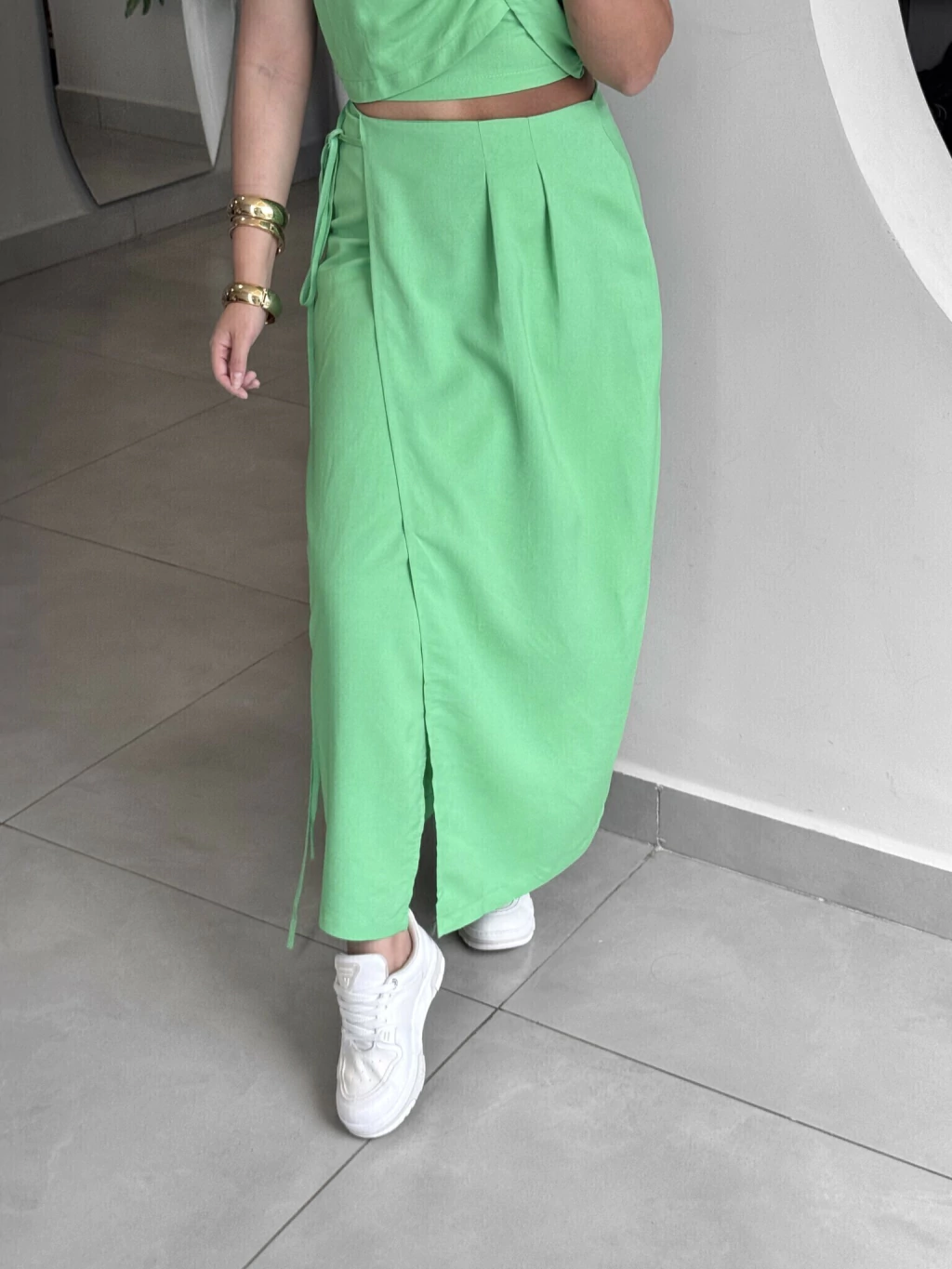 O Conjunto Enjoy é composto por um cropped e uma saia midi. O cropped possui alças finas e um detalhe frontal que cria um efeito drapeado. A saia midi tem um caimento fluido e um ajuste lateral com amarração, proporcionando um efeito transpassado que confere um toque delicado e uma estética clean. A modelo Alyce está usando o tamanho M, com medidas de 88 cm de busto, 74 cm de cintura e 108 cm de quadril.