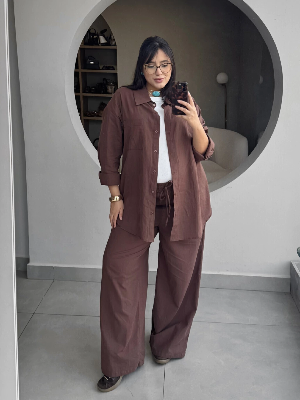 A calça possui elástico na cintura, que se ajusta facilmente ao corpo e deixa tudo confortável, do jeitinho que a gente gosta. Tem bolsos funcionais e forro para evitar qualquer transparência, perfeito para o dia a dia. A camisa é oversized, mais soltinha, e isso dá uma liberdade enorme para usar do seu jeito: aberta, fechada, com nózinho, até por cima do biquíni na praia. Combina com tudo e te acompanha em várias ocasiões. O tecido é 100% viscose, mas com uma textura que lembra o linho, trazendo aquele toque natural, fresquinho e leve. É um tecido que “respira” com você, ótimo para os dias mais quentes, e tem um caimento que se movimenta junto com seu corpo, sem pesar.