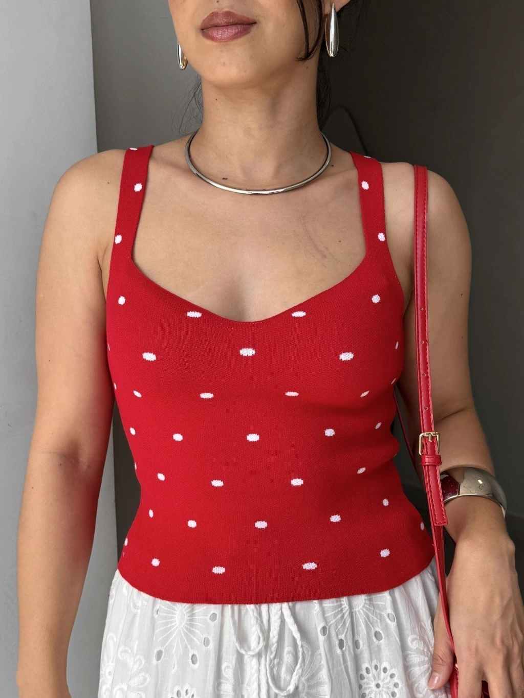 Delicado, versátil e cheio de charme, feito em tricot macio e leve, com caimento confortável e toque super gostoso, ele é perfeito tanto pra usar no dia a dia quanto pra compor produções mais estilosas. O decote levemente em formato de coração valoriza o colo de forma sutil, e as alças largas garantem sustentação e praticidade (sim, dá pra usar com sutiã tranquilamente!). E mesmo sendo um cropped, o comprimento é ideal: não é tão curto, o que deixa o visual moderno, mas ainda super usável. A clássica estampa de poá dá um toque retrô que nunca sai de moda, e as cores disponíveis são apaixonantes, delicadas, vibrantes e fáceis de combinar. Fica lindo sozinho ou como sobreposição com camisas.