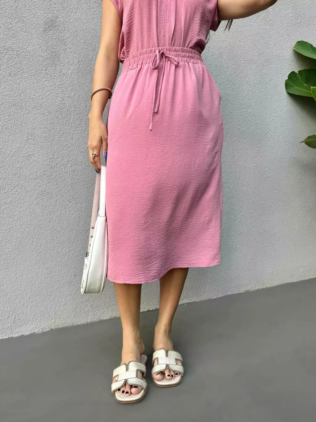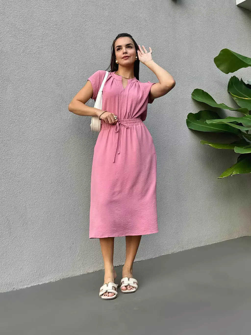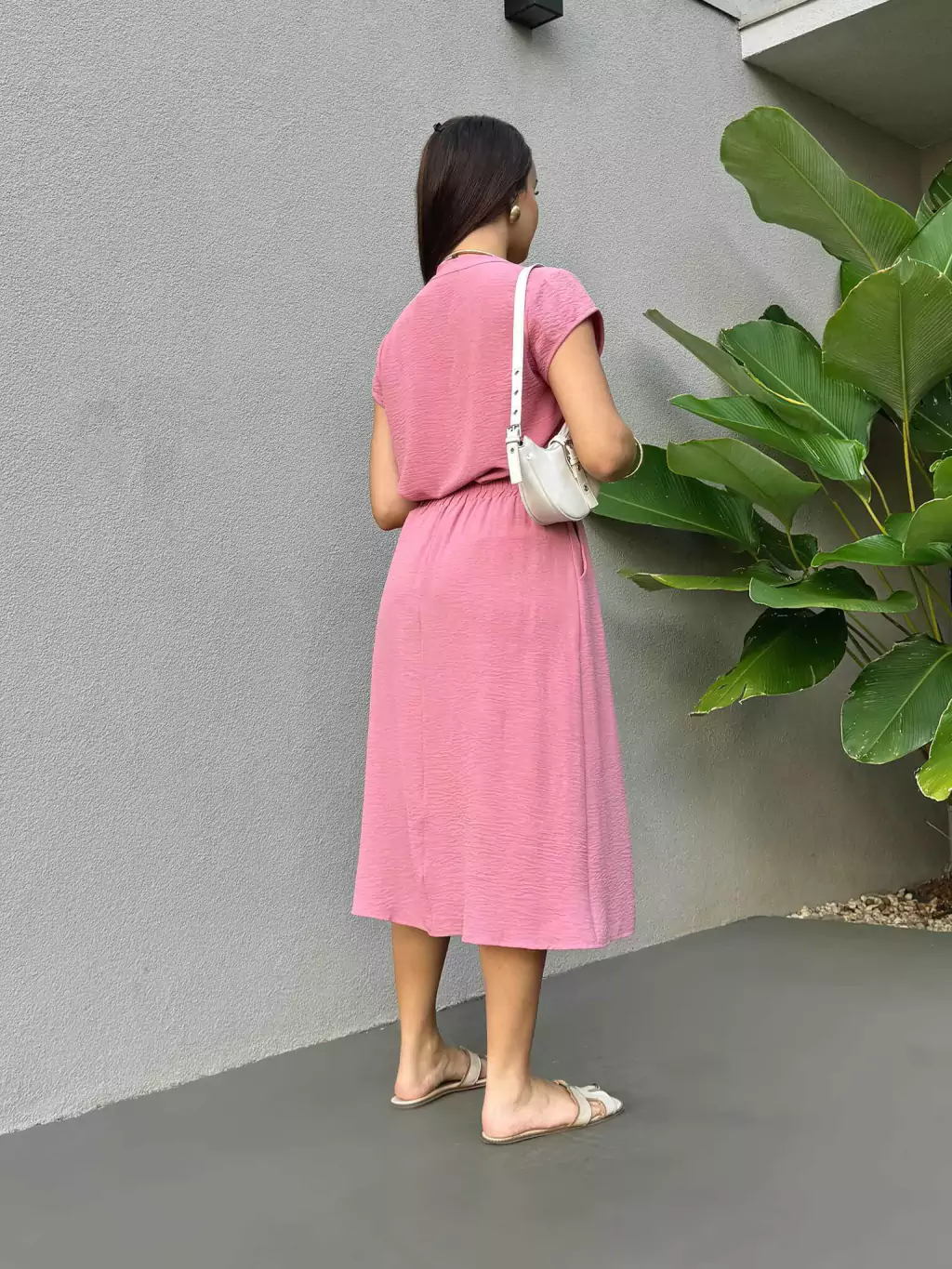 Saia midi confeccionada em crepe duna, apresentando cós elástico para conforto e ajuste ideal. Inclui bolsos tipo faca e possui corte evasê, garantindo um movimento suave e elegante.