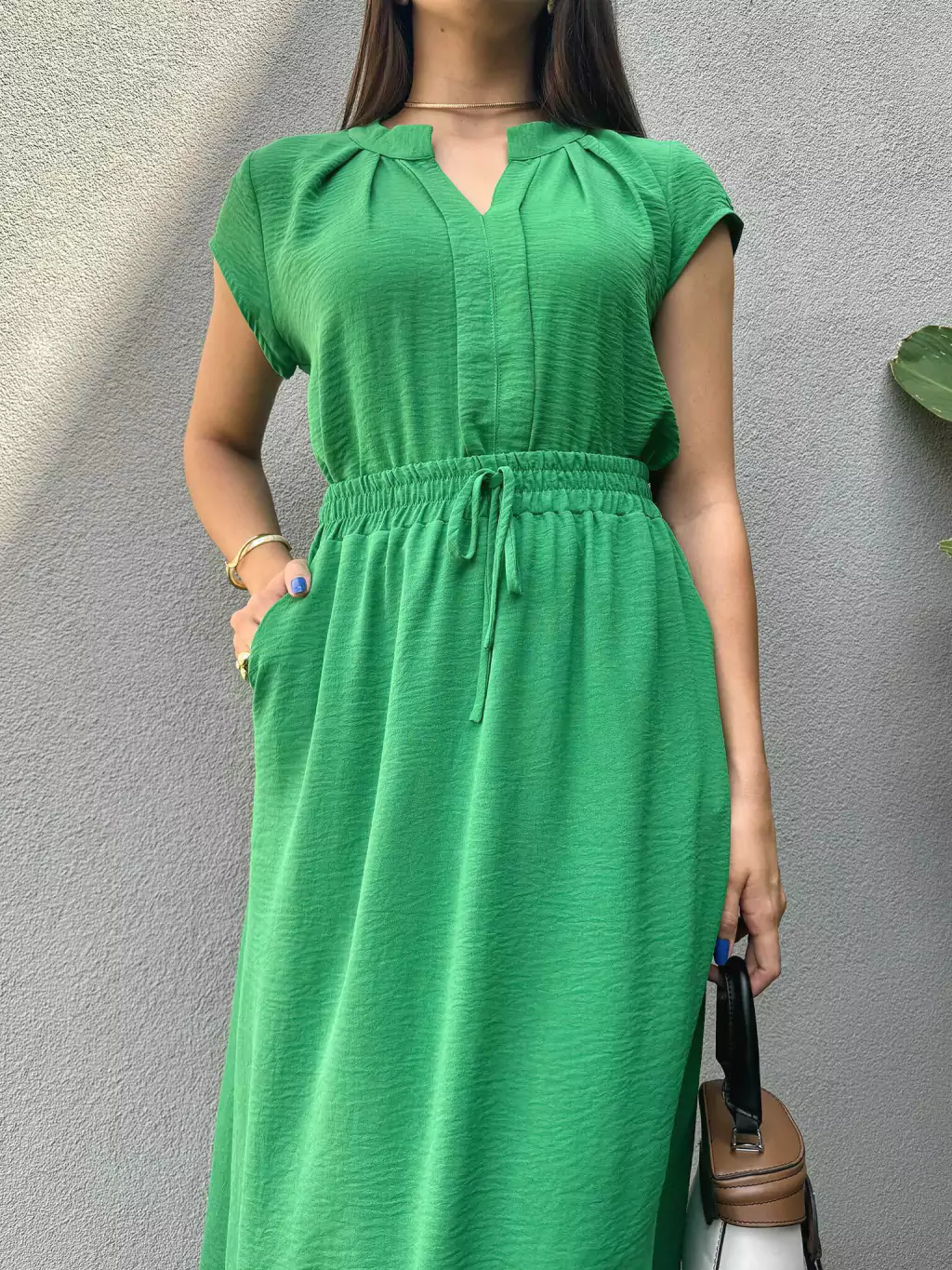 Saia midi confeccionada em crepe duna, apresentando cós elástico para conforto e ajuste ideal. Inclui bolsos tipo faca e possui corte evasê, garantindo um movimento suave e elegante.