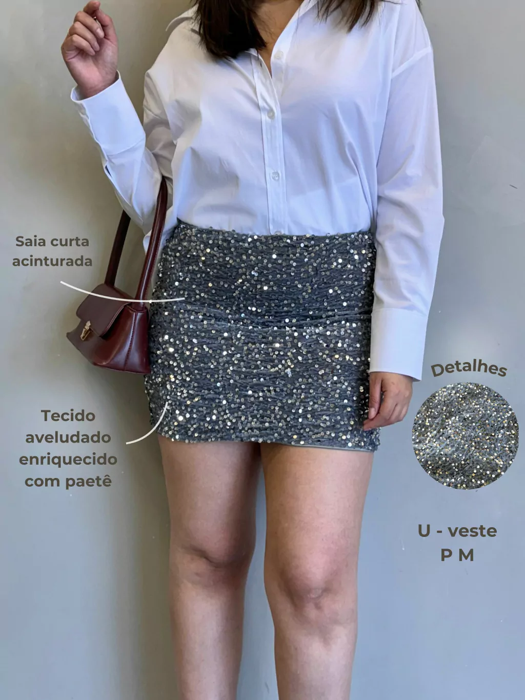 Saia curta e acinturada, confeccionada em tecido aveludado enriquecido com paetês. O modelo tem corte reto e é reforçado com um forro interno para garantir conforto e elegância.
