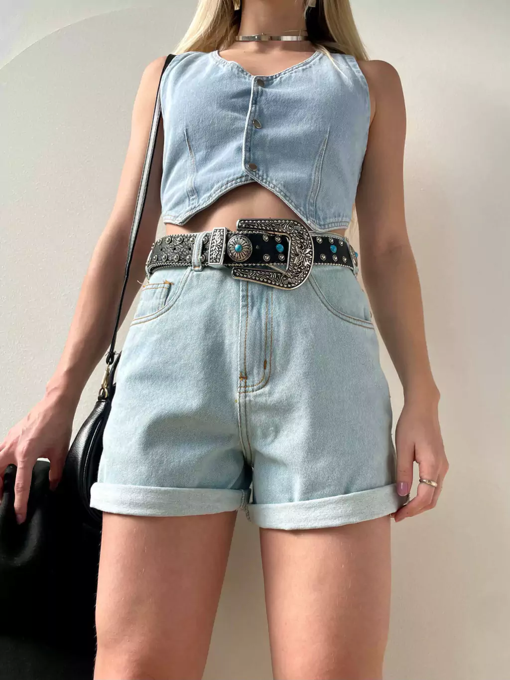 Short mom jeans em lavagem clara, conta com passantes no cós para cinto e fechamento frontal atráves de botão e zíper. Além disso, possui bolsos funcionais na parte frontal e traseira.